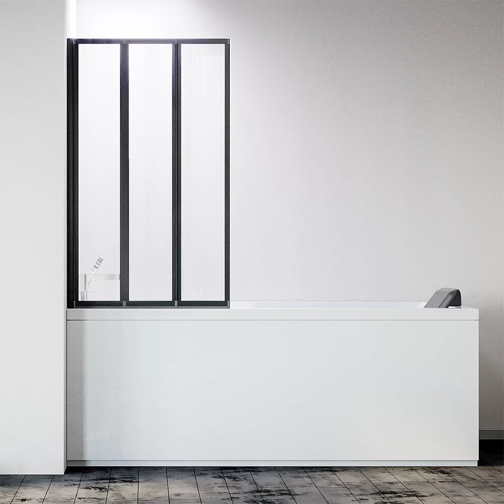 Размеры: 120х150 см. Прозрачное стекло 6 мм. Профиль: черный, анодированный алюминий. Крепление: на борт ванны. Шторка на ванну складная левая