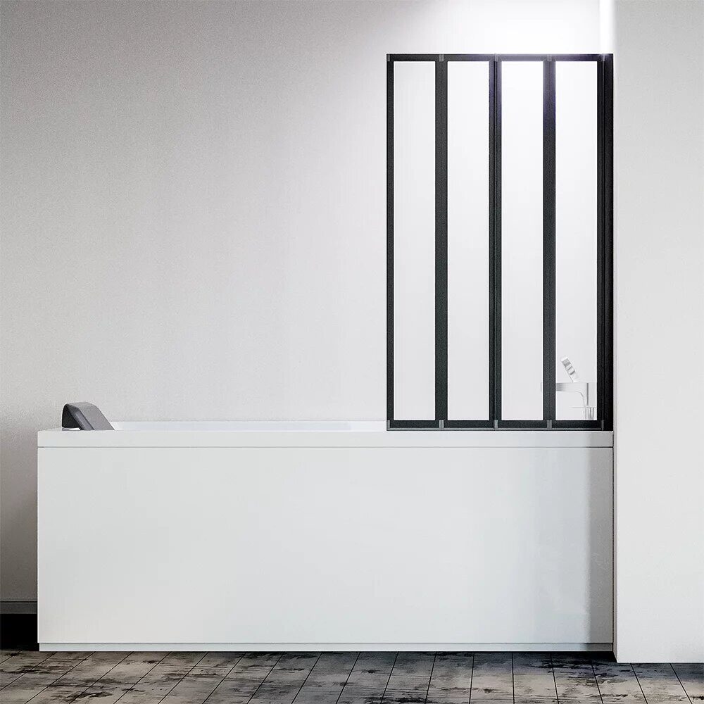 Размеры: 90х150 см. Прозрачное стекло 6 мм. Профиль: черный, анодированный алюминий. Крепление: на борт ванны. Шторка на ванну складная правая