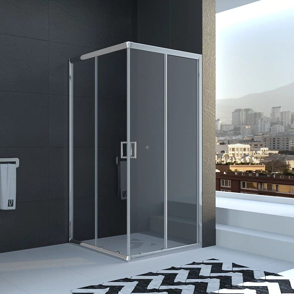 Размеры: 140х195 см. Стекло: прозрачное, 5 мм. Покрытие: матовое. Профиль: хром, анодированный алюминий. Дверь: раздвижная. Ширина входа: 810 мм.