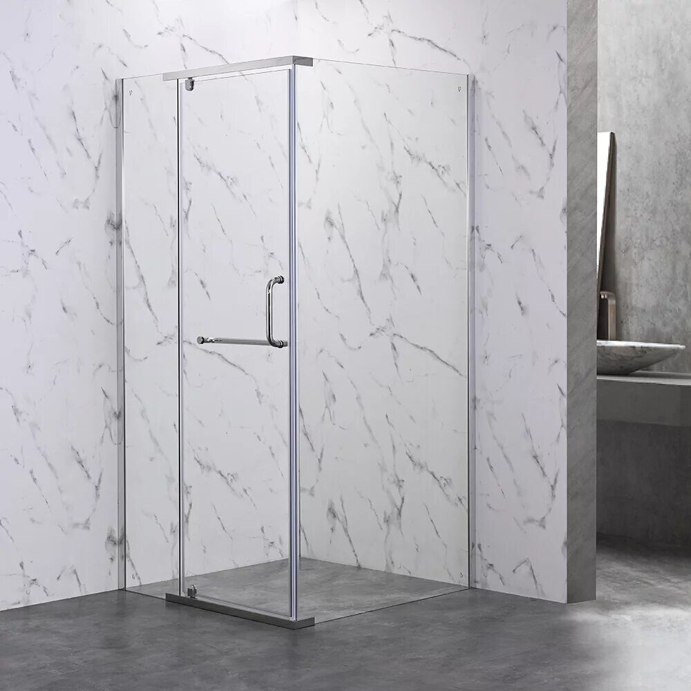 Размеры: 100х190 см. Прозрачное стекло 6 мм. Профиль: хром, анодированный алюминий. Фиксированная боковая панель без верхнего и нижнего профиля