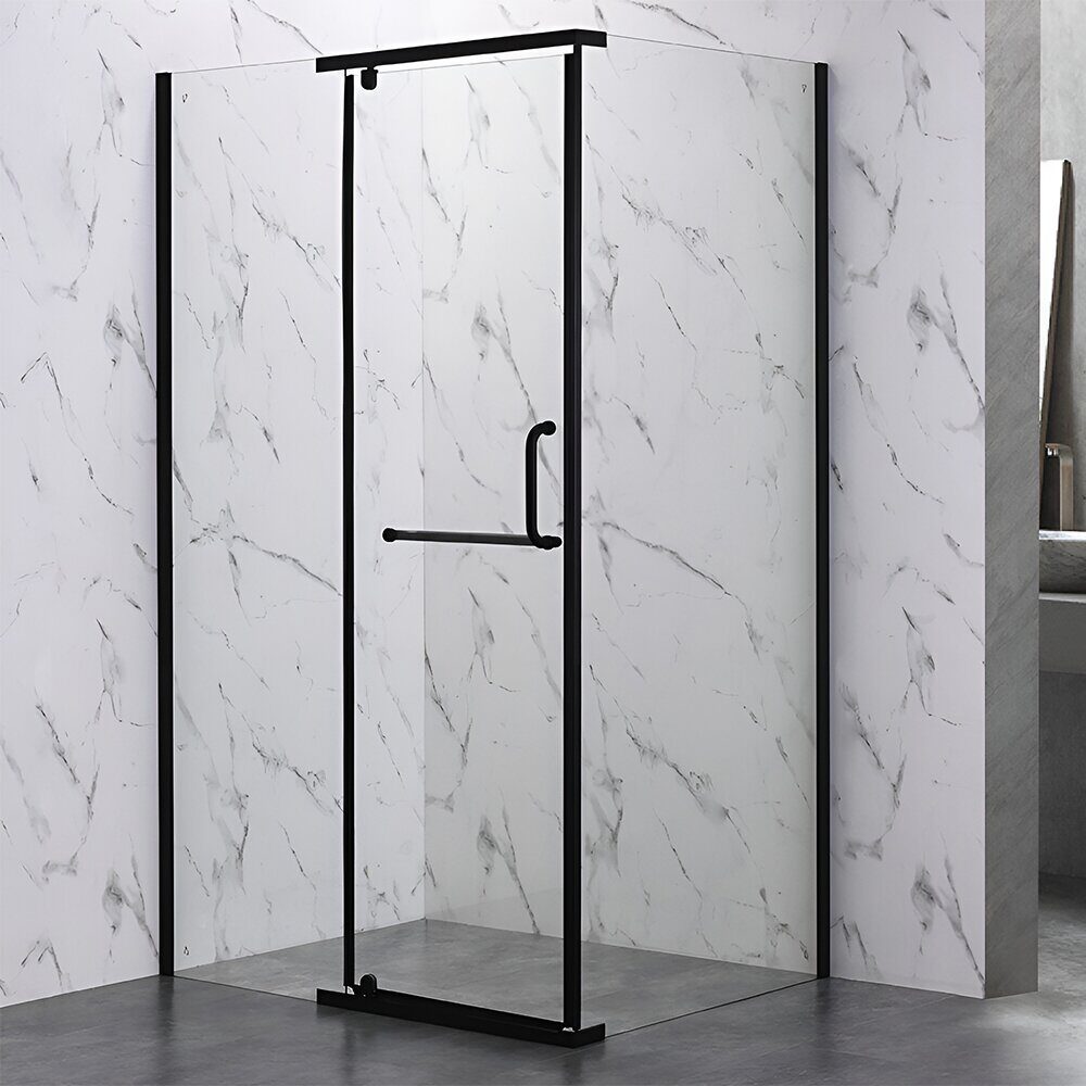 Размеры: 120х195 см. Прозрачное стекло 6 мм. Профиль: черный, анодированный алюминий. Фиксированная боковая панель без верхнего и нижнего профиля