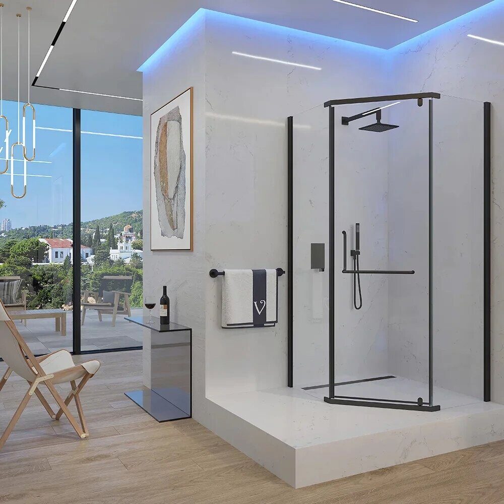 Размеры: 70х195 см. Прозрачное стекло 6 мм. Профиль: черный, анодированный алюминий. Фиксированная боковая панель без верхнего и нижнего профиля