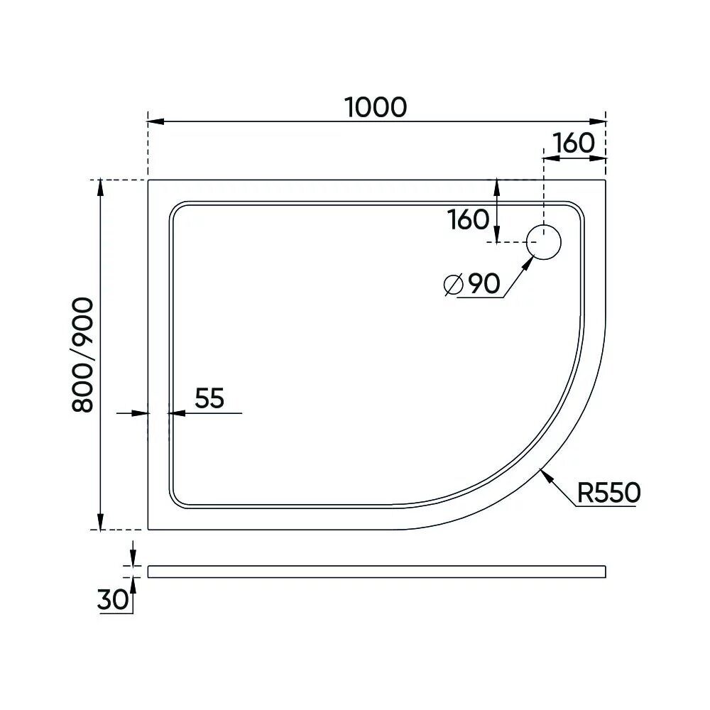Размеры: 80x3 см. Материал: искусственный камень. Нагрузка на поддон: до 300 кг. Поверхность глянцевая. Душевой поддон асимметричный (правый)