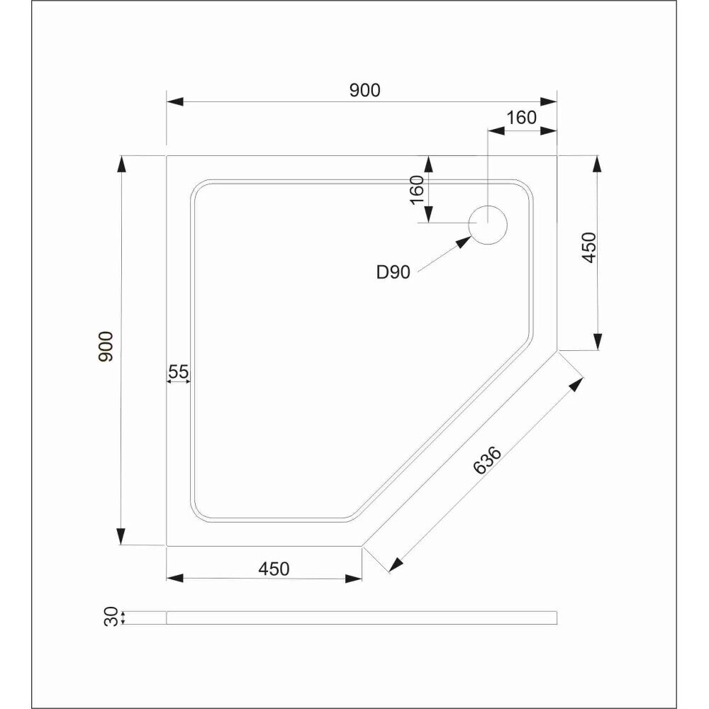 Размер: 90х90х15 см. Материал: литьевой акрил 6 мм. Форма: квадратная. Цвет: белый. Смонтирован на металлическую раму, изнутри армирован стекловолокном. Предусмотрен монтаж в угол. Комплект: металлический каркас, регулируемые ножки, сифон.