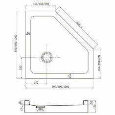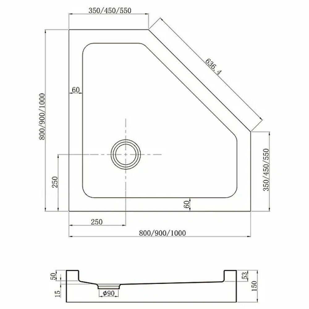 Размеры: 90x90х15 см. Материал: акрил. Нагрузка на поддон: до 200 кг. Поверхность матовая. Душевой поддон трапециевидный