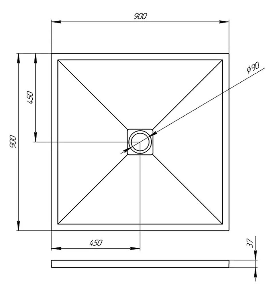 Размеры: 90х90x3 см. Материал: искусственный камень. Нагрузка на поддон: до 300 кг. Поверхность матовая. Душевой поддон квадратный