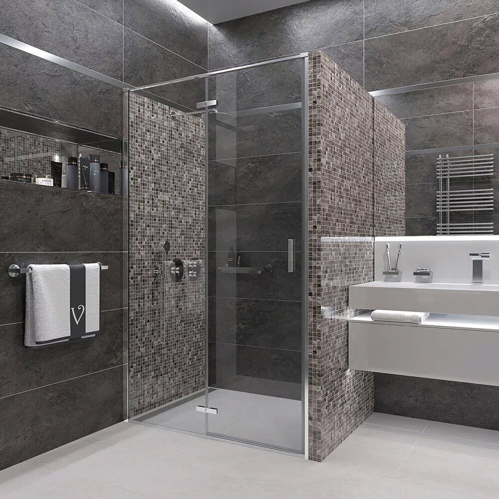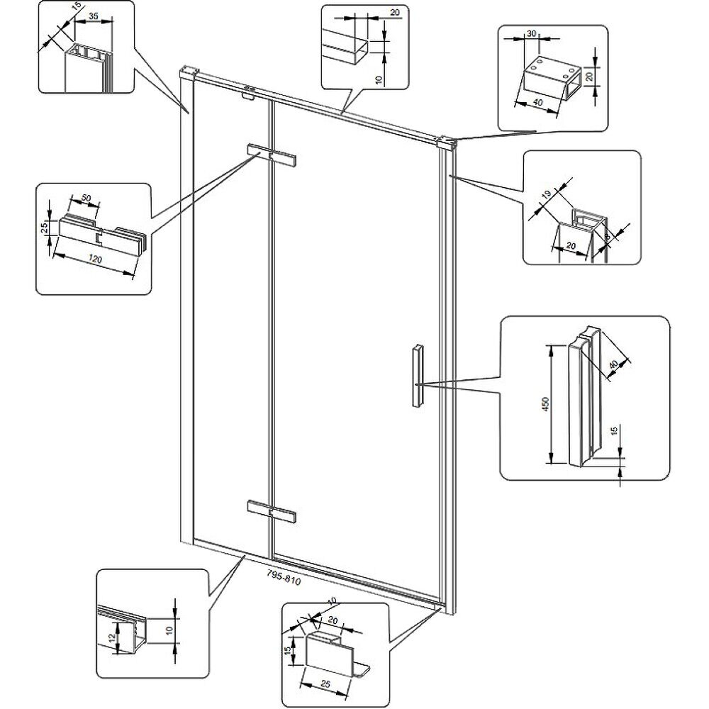 Размеры: 80х195 см. Стекло: прозрачный, 6 мм. Профиль: хром, анодированный алюминий.