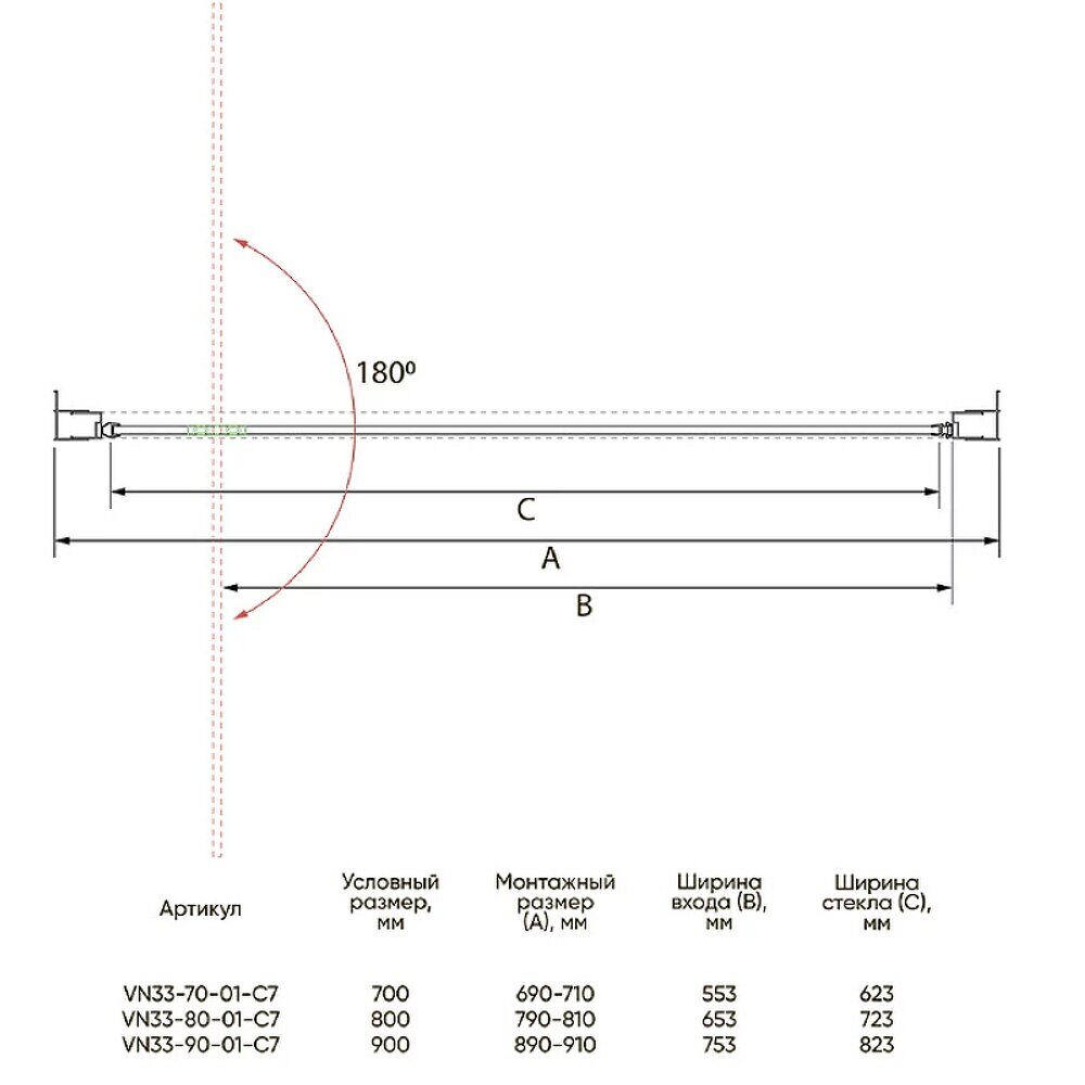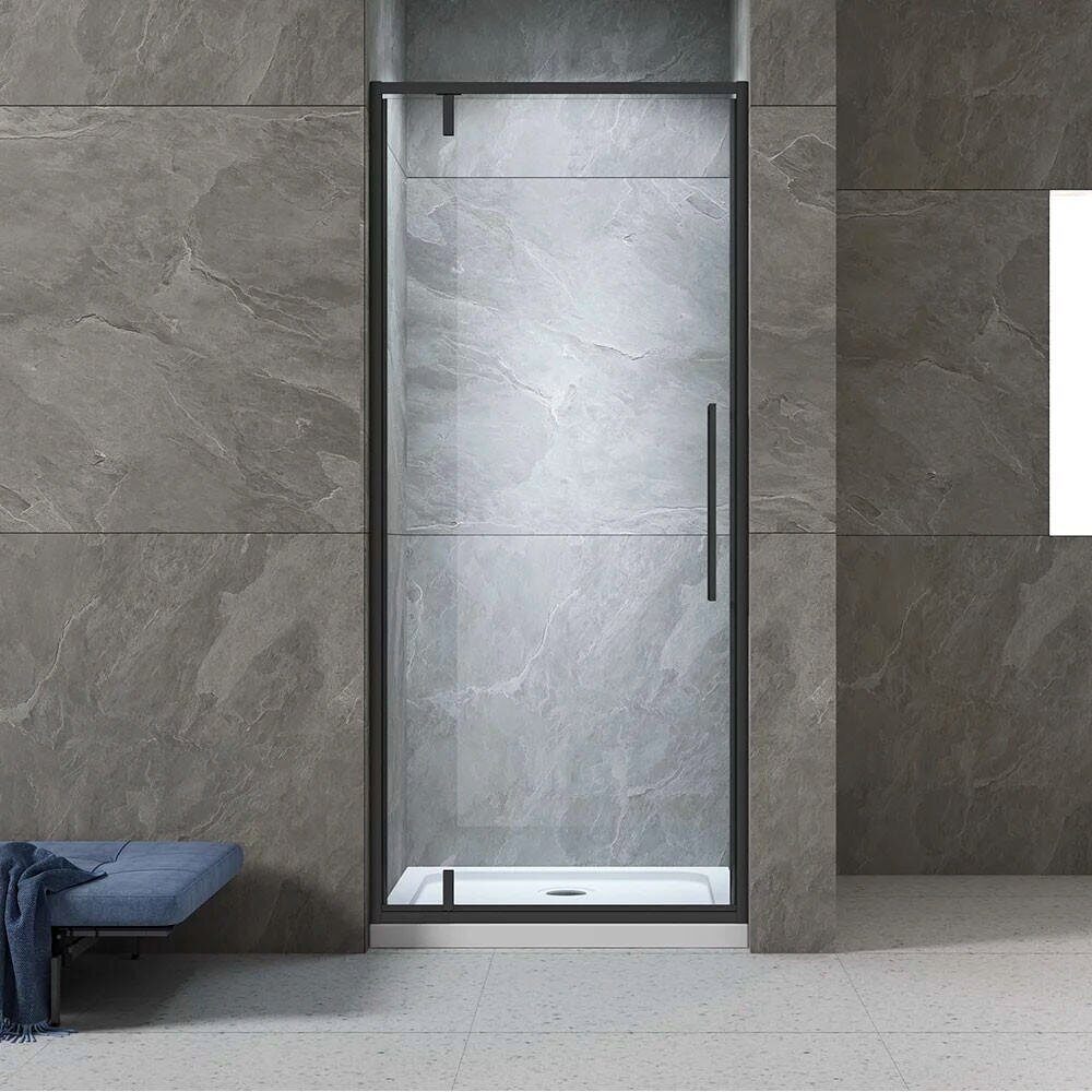 Размеры: 70х195 см. Стекло: прозрачное, 6 мм. Покрытие: матовое. Профиль: черный, анодированный алюминий. Дверь: распашная, открывается в обе стороны. Ширина входа: 553 мм.