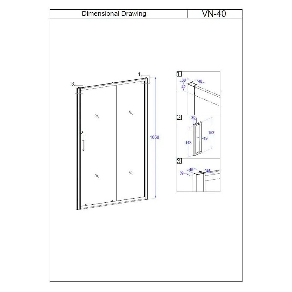 Размеры: 120х185 см. Стекло: прозрачный, 5 мм. Профиль: черный, анодированный алюминий. Покрытие: матовое. Ширина входа: 510 мм. Раздвижная дверь и одно неподвижное стекло