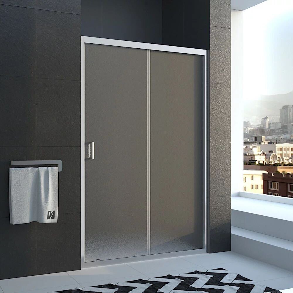 Размеры: 170х185 см. Стекло: рифленое, 6 мм. Покрытие: матовое. Профиль: хром, анодированный алюминий. Дверь: раздвижная. Ширина входа: 750 мм.