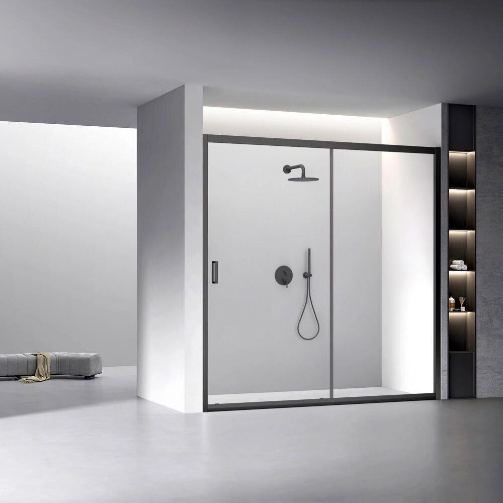 Размеры: 170х195 см. Стекло: прозрачное, 6 мм. Покрытие: матовое. Профиль: черный, анодированный алюминий. Дверь: раздвижная. Ширина входа: 740 мм.