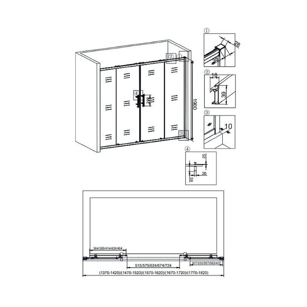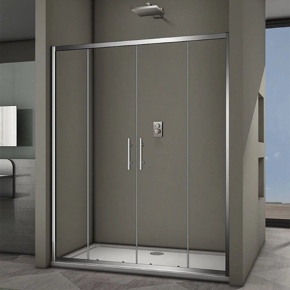 Размеры: 160х190 см. Прозрачное стекло 6 мм. Профиль: хром, анодированный алюминий. Ширина входа: 624 мм. Раздвижные двери из центра.