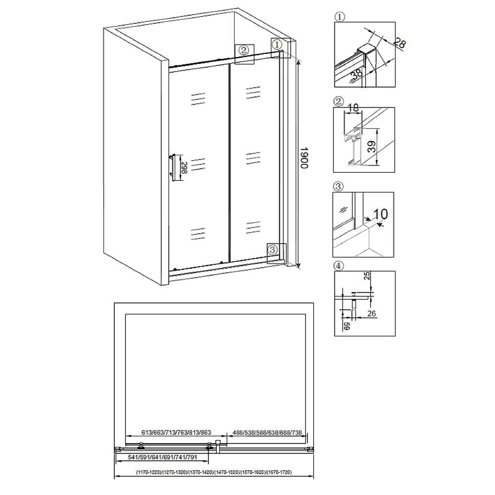 Размеры: 120х190 см. Стекло: прозрачное, 6 мм. Покрытие: матовое. Профиль: хром, анодированный алюминий. Дверь: раздвижная. Ширина входа: 488 мм.