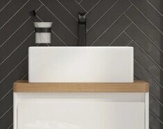 Стильные ручки и накладная раковина дополняют тумбу и подчеркивают характер модели.