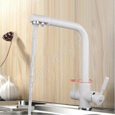 Цвет: белый. На одно отверстие, на гайке. Излив поворотный, высокий, 30 см. Материал: латунь. В комплекте: душевой шланг 150 см, душевая лейка, держатель лейки, комплект отражателей, комплект эксцентриков