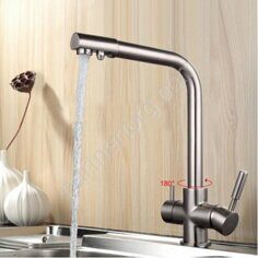 Цвет: песочный. На одно отверстие, на гайке. Излив поворотный, высокий, 30 см. Материал: нержавеющая сталь. В комплекте: гибкая подводка 1/2