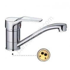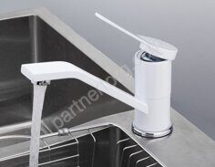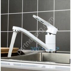 Цвет: белый. На одно отверстие, на гайке. Излив поворотный, средний, 25 см. Материал: латунь. В комплекте: гибкая подводка 1/2