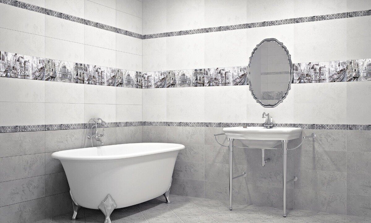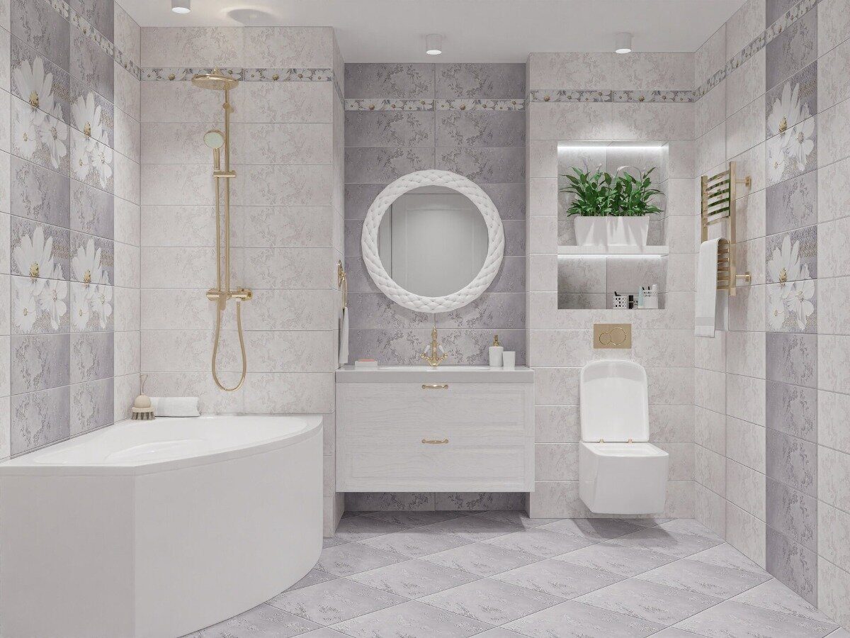 Нежные ромашковые цветы панели «Floret» контрастируют с основной плиткой, а панно «Vistas» можно укладывать как из двух плит, так и в виде горизонтальной полосы, добавляя в ванную комнату элемент дворцовой роскоши.