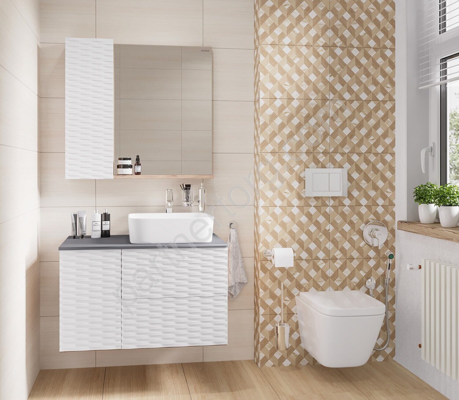 Тумба подвесная "АЛЬБА-80 см" - функциональное и практичное исполнение. Белый матовый цвет с 3D рисунком безупречно сочетается с фактурой под дерево и позволяет тумбе органично вписаться в интерьер ванной комнаты.