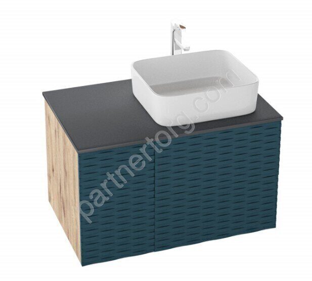 Размеры: 80х50х50см.  Цвет корпуса: Дуб веллингтон (дерево натуральных оттенков);  фасадов: Бриз (бирюзовый);  столешницы: серый. Конструкция: 2 выдвижных ящика. Раковина приобретается отдельно