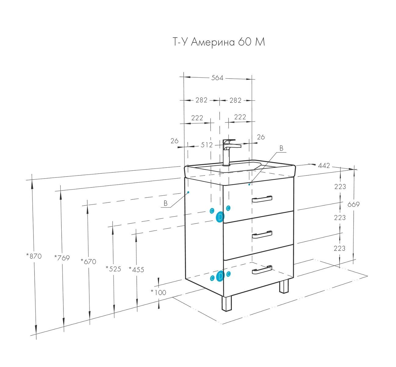 Размеры (мм): Тумба Америна 60 М: ширина - 564, высота - 688, глубина - 442