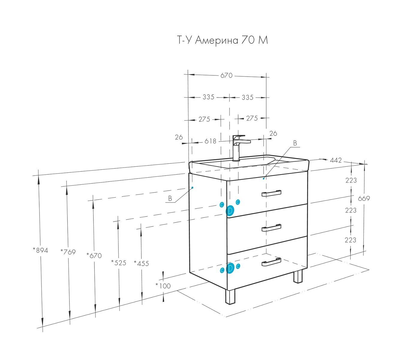 Комплект поставки: Тумба Америна 70 М (ручки – 3шт, ящик- 3 шт, ножки- 2шт), раковина Тигода 70