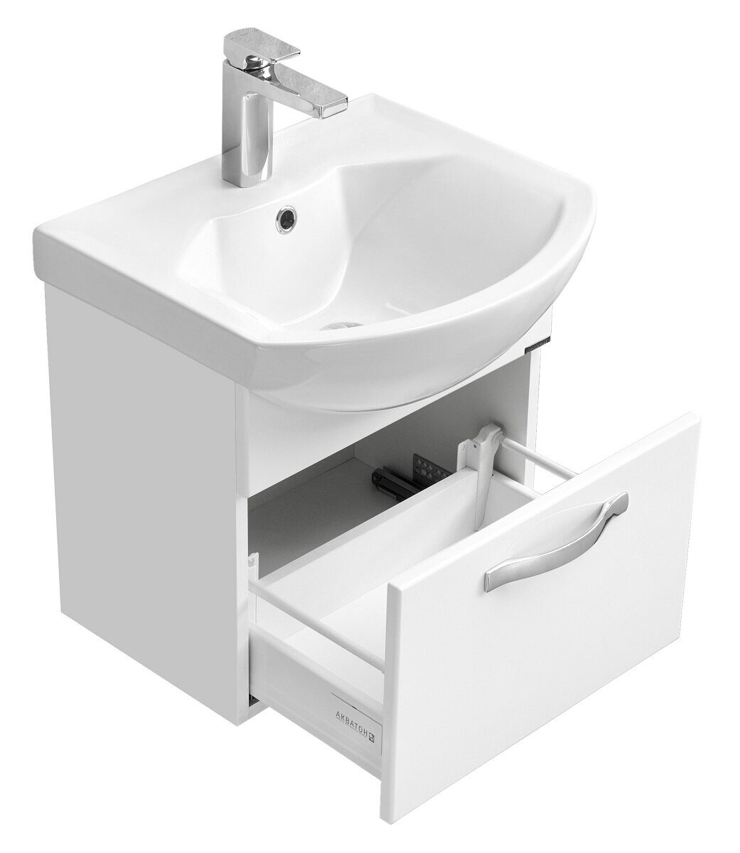 Комплектация: регулируемый навес - 2 шт., Ручка - 1 шт., Выдвижной ящик (направляющие с интегрированной системой плавного закрывания) - 1 шт. Раковина Смайл 50