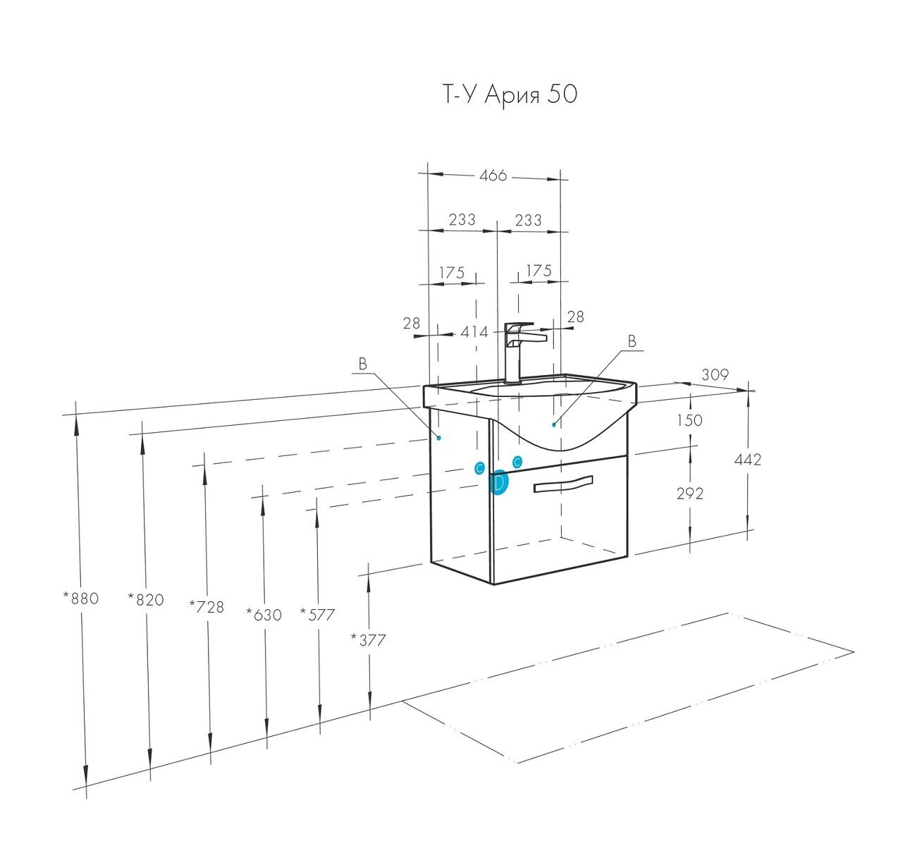 Раковина: Раковина "Смайл 50" из санфарфора, которая не требует отдельного крепежа и устанавливается в пазы напольной тумбы. Установка проста и не требует квалифицированного специалиста.