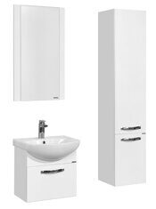 Набор мебели в ванную комнату Ария 50 состоит из подвесной тумбы, зеркала и подвесного шкафа-колонны. В тумбе за фасадом расположен 1 ящик из декоративной влагостойкой ДСП со вставками, организующими его пространство.