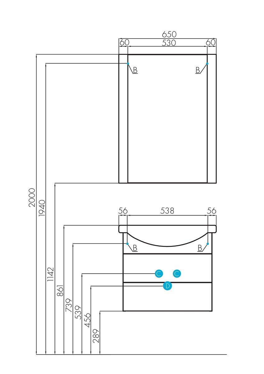 Набор мебели в ванную комнату Ария 65 М состоит из подвесной тумбы, зеркала и подвесного шкафа-колонны. В тумбе за фасадом расположены 2 ящика из декоративной влагостойкой ДСП со вставками, организующими его пространство.