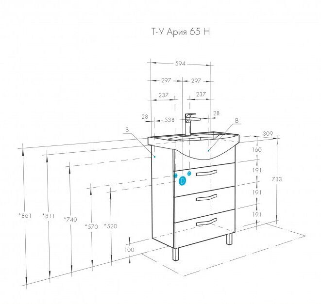 Размеры (мм): Тумба: ширина - 594, высота - 633, глубина - 309