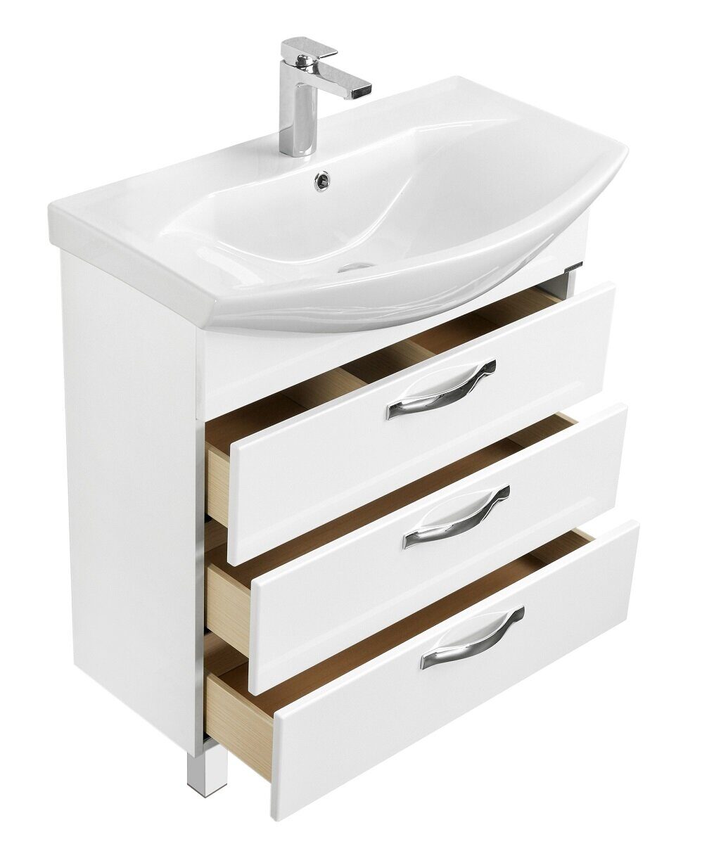 Комплект поставки: ручка - 3 шт., Ножки - 2 шт., Регулируемый навес - 2 шт., Выдвижной ящик (направляющие с интегрированной системой плавного закрывания) - 3 шт., Тумба - 1 шт., раковина Смайл 65