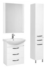 Набор мебели Акватон Ария 65 Н подходит для небольших санузлов. Тумба и колонна устанавливаются на пол при помощи регулируемых по высоте ножек. В тумбе – три выдвижных ящика из влагостойкой ДСП, верхний из которых снабжен организацией пространства. В колонне внизу расположен откидной фасад с бельевой корзиной, а за верхним распашным фасадом расположены регулируемые по высоте полочки. Модель выпускается в белом, черном и темно-коричневом глянцевых цветах.