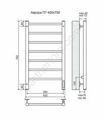 Размер: 400х750мм. Перекладины: 7шт, равноудаленные. Цвет: хром. Напряжение питания: 220В. Мощность: 90Вт. Универсальное подключение: скрытое  или через провод (по умолчанию в комплекте). ТЭН справа.