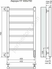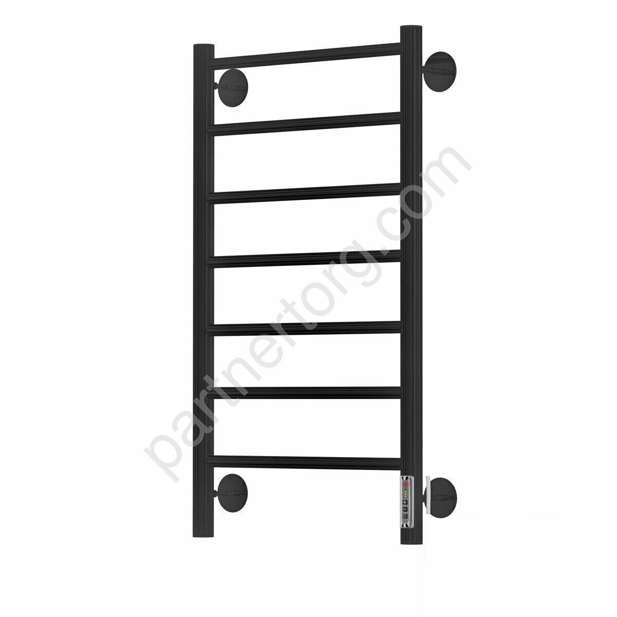 Размер: 400х750мм. Перекладины: 7шт, равноудаленные. Цвет: черный. Напряжение питания: 220В. Мощность: 90Вт. Универсальное подключение: скрытое  или через провод (по умолчанию в комплекте). ТЭН справа.