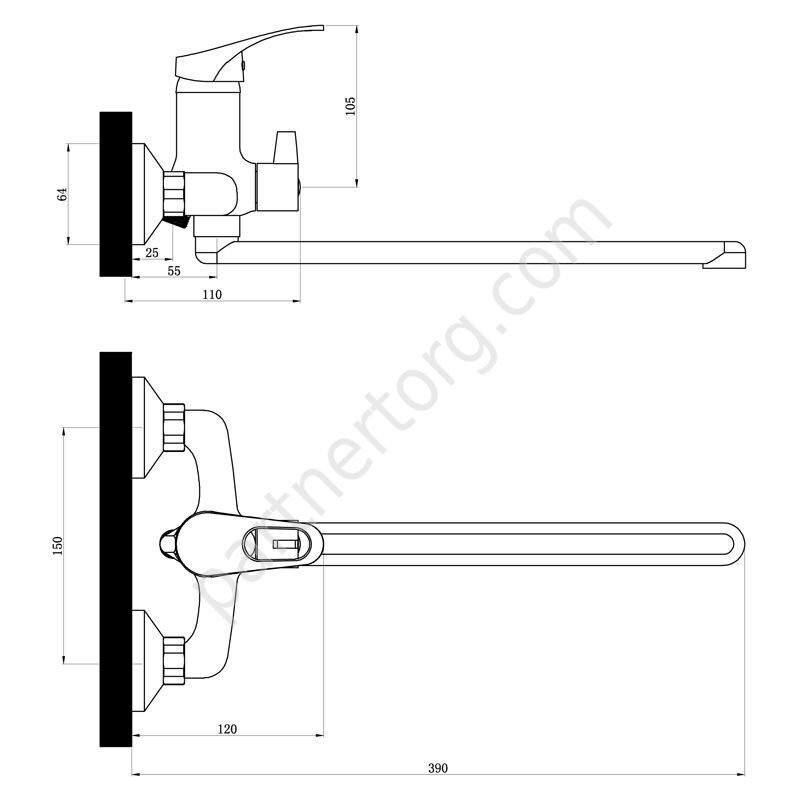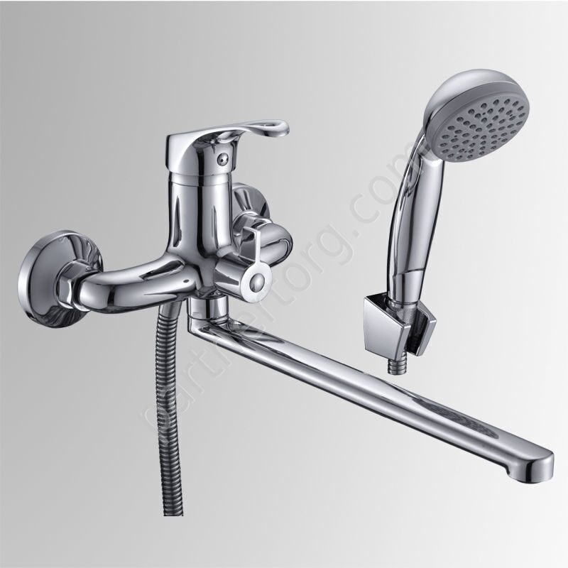 Флажковый. Материал: Латунь. Покрытие: никель-хромовое; Цвет: хром; Излив: стальной, поворотный, 35 см. Комплект: лейка, шланг, крепление для лейки на смесители и настенное, дивертор