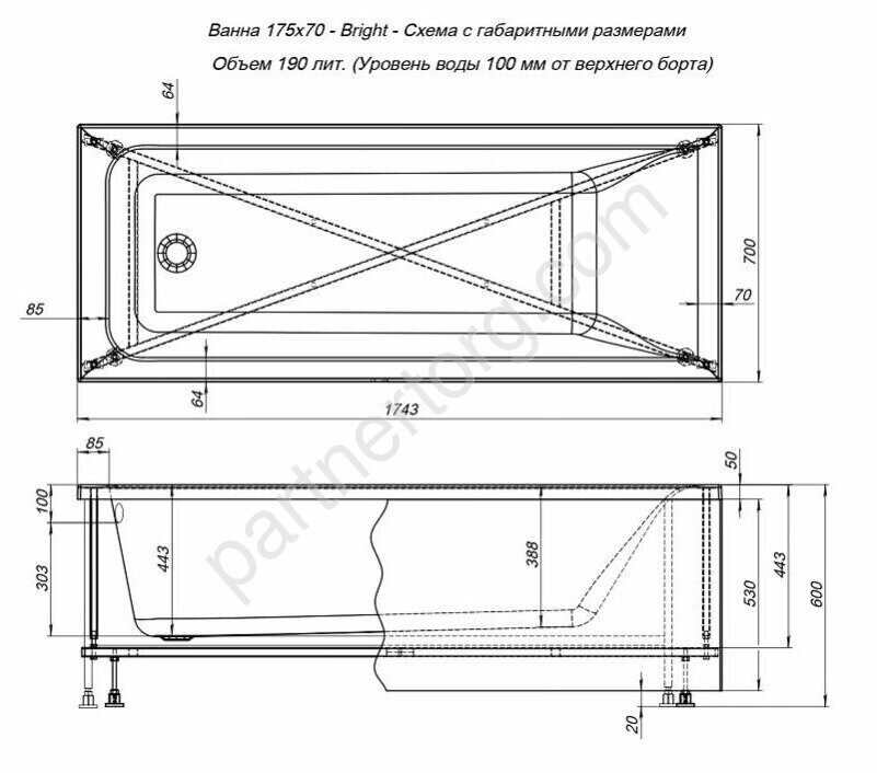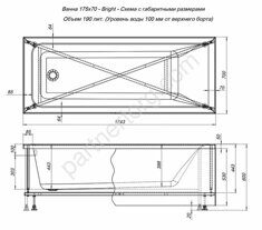 Размер: 175х70 см. Объем: 190л. Глубина: 393 мм. Цвет: белый.