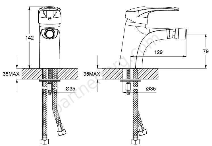 Однозахватный смеситель для биде. Латунь. Увеличенное никель-хромовое покрытие. Керамический картридж Sedal 40 мм., силиконовый аэратор Neoperl. В комлекте: гибкая подводка (35 cм.), крепеж.