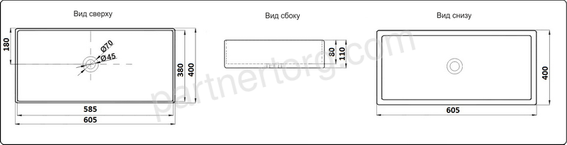 Размеры: 60х40,5х11см. Цвет: черный матовый. Без перелива. Без отверстия под смеситель