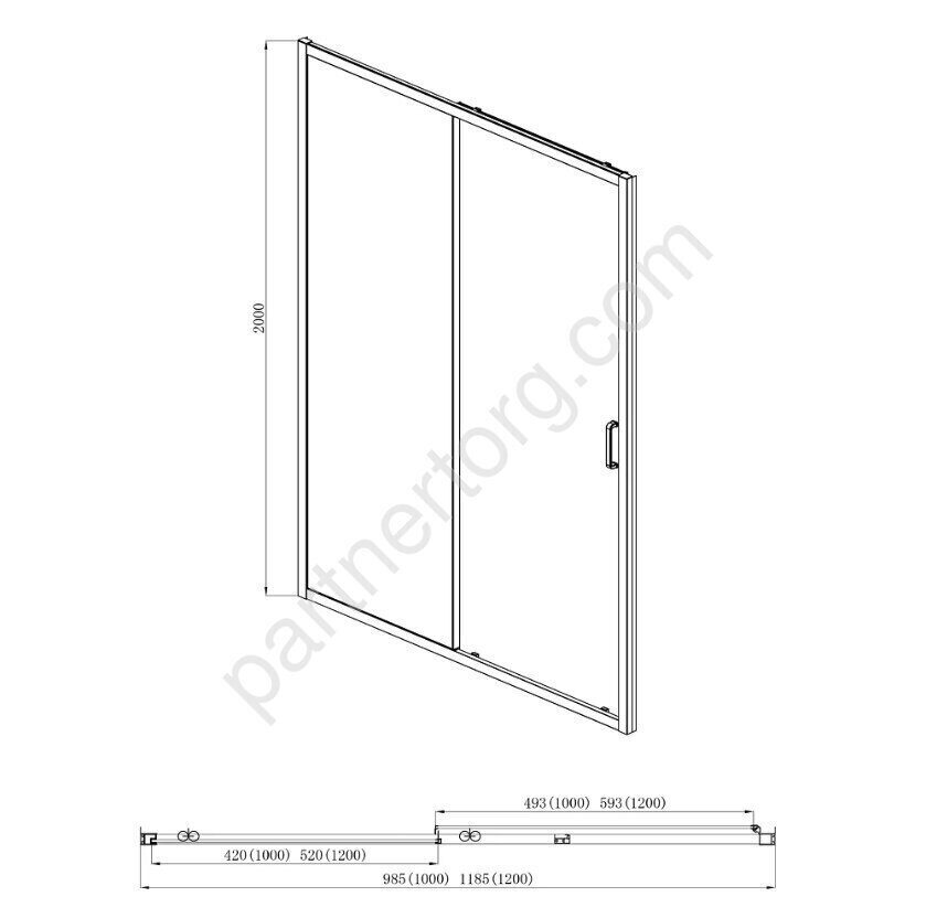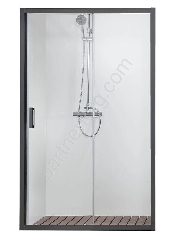 Размер: 100х200см. Для монтажа на пол, на поддон.   Раздвижная, 2 элемента. Профиль черный. Секло прозрачное закаленное 6мм.