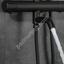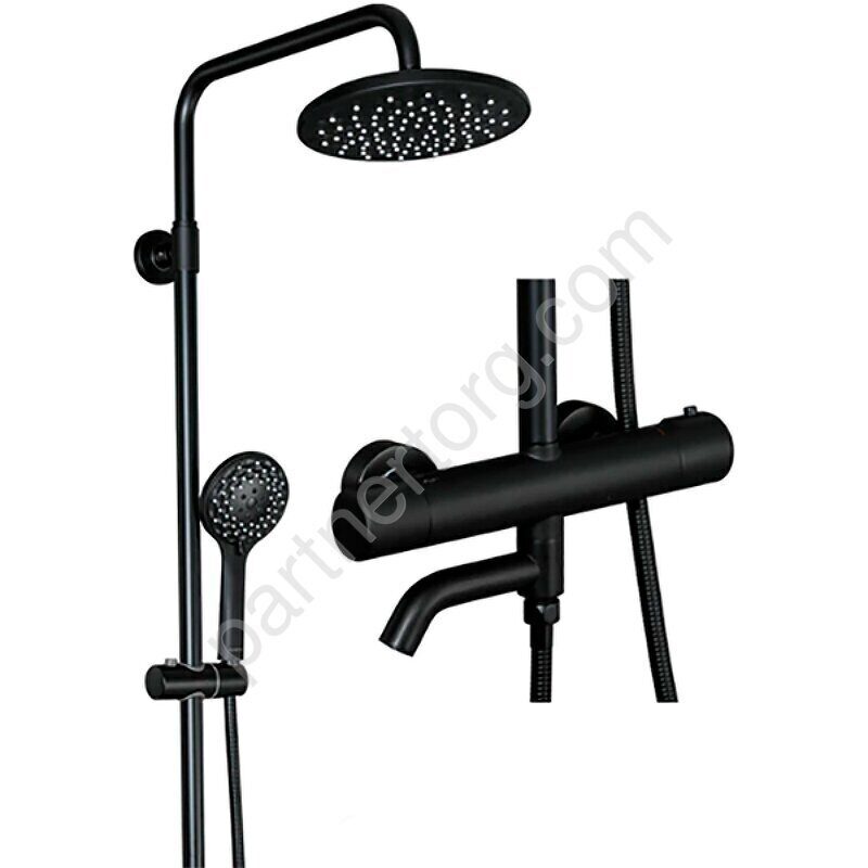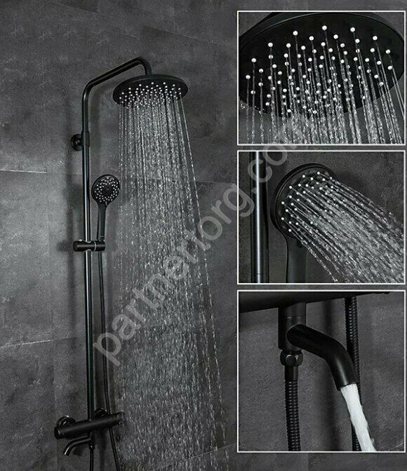 Душевая система со смесителем с термостатом, ручным и тропическим душем черная отличаются современным дизайном, удобной конструкцией, простотой в установке и использовании.