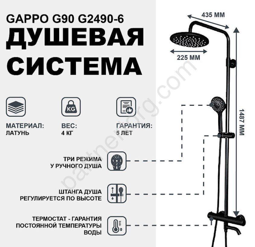 G2490-6 система с тропическим и ручным душем, смесителем с термостатом Gappo