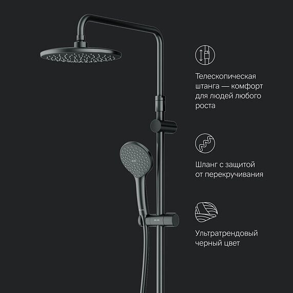 В комплектацию душевой системы входят: тропический душ, ручной душ, стильный смеситель с изливом, эксцентрики, держатели штанги и душа. Длина душевой штанги - 1030-1460 мм. Длина душевого шланга - 1750 мм. Размер ручного душа - 120 мм. Диаметр верхнего душа - 220 мм.
