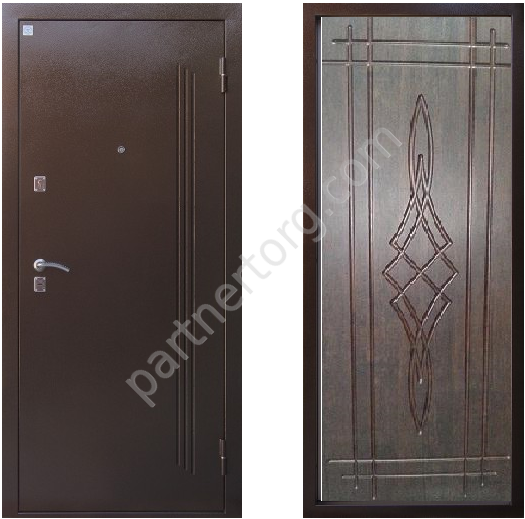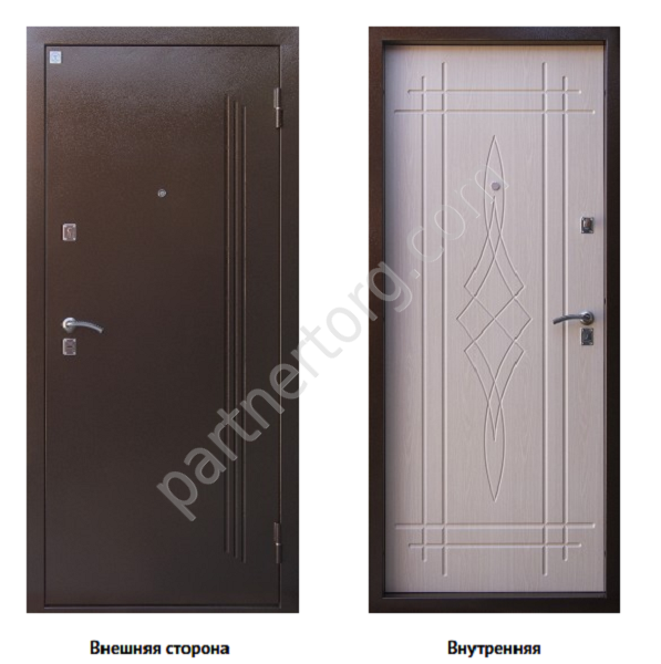 Размеры 880х2050, 960х2050 мм. Сталь: 1,5 мм. Основной замок «Гардиан» 3011. Дополнительный замок «Гардиан» 3201. Уплотнитель Специализированный дверной уплотнитель (на полотне в паз и на коробе) по всему периметру. Декоративная гладкая внутренняя МДФ панель 8 мм: цвет дуб беленый, тиковое дерево.Доступен индивидуальный дизайн.