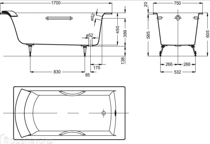 Biove E2938-00 ванна чугунная 170х75 см Jacob Delafon с отверстиями для ручек