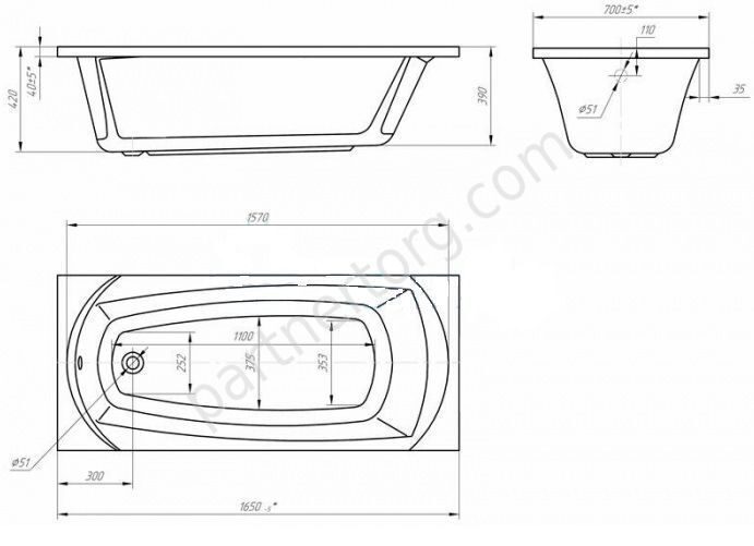 Размеры: 165х70х63см. Глубина 42 см. Объем 178л. прямоугольная