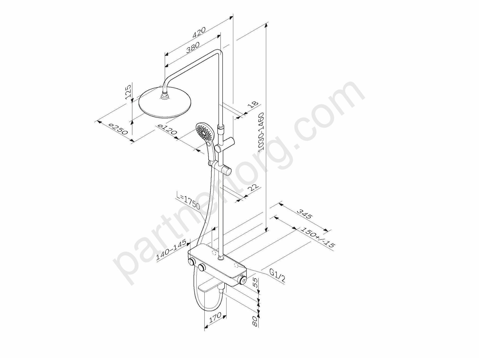 Размер: 46×80×17 см. Излив фиксированный, длина 15 см. Материал: латунь. Комплект: Керамический картридж 35 мм, Переключатель с керамическими пластинами, 3-функциональная лейка, Присоединительная группа, Металлическая рукоятка