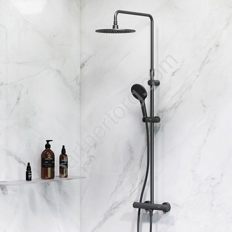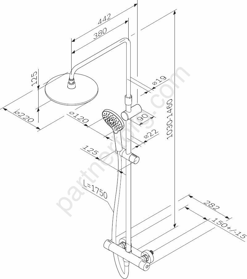 Продуманные детали для удобства использования: штанга регулируется по высоте в диапазоне от 1030 до 1460 мм, обеспечивая комфорт для людей любого роста, шаровый шарнир в держателе верхнего душа позволяет регулировать угол его наклона, душевой шланг 1750 мм, верхний душ диаметром 220 мм, ручной душ диаметром 120 мм.