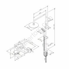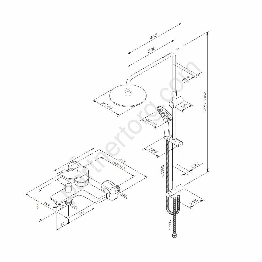 В комплектацию душевой системы входят: тропический душ, ручной душ, держатели штанги и душа. Длина душевой штанги 1030-1460 мм. Длина душевого шланга 1750 мм. Размер ручного душа 120 мм. Диаметр верхнего душа 250 мм.