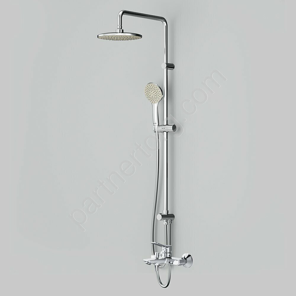 В комплектацию душевой системы входят: тропический душ, ручной душ, смеситель-полочка с изливом, эксцентрики, держатели штанги и душа. Длина душевой штанги - 1030-1460 мм. Длина душевого шланга - 1750 мм. Размер ручного душа - 120 мм. Диаметр верхнего душа - 250 мм.